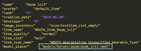 那么有这个可能性吗?我们来看看两个游戏的皮肤机制。在刀塔 2 里的英雄模型代码中,首先是有人物的基本模型,然后可以设置在不同部位装配的饰品。